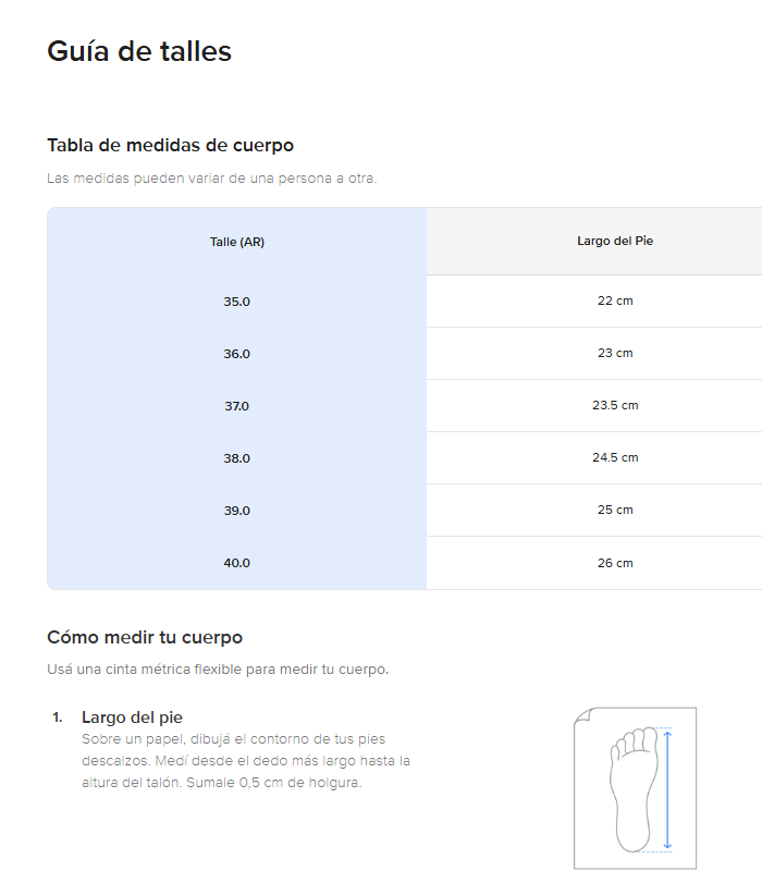 Corroborá tu talle con las equivalencias de la tabla (podés verla en las fotos). Lo hacés midiendo desde el talón, hasta la punta del dedo pulgar. Tené en cuenta que si estás entre dos talles, elegí siempre el más grande. A su vez, SIEMPRE aclaramos que la tabla es aproximada, y recomendamos elegir tu talle habitual, salvo que te indiquemos previamente que la horma es distinta.