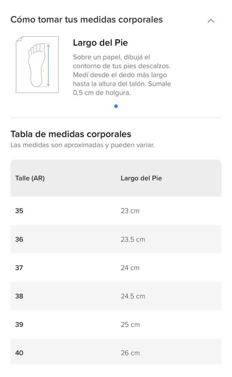 Corroborá tu talle con las equivalencias de la tabla (podés verla en las fotos). Lo hacés midiendo desde el talón, hasta la punta del dedo pulgar. Tené en cuenta que si estás entre dos talles, elegí siempre el más grande. A su vez, SIEMPRE aclaramos que la tabla es aproximada, y recomendamos elegir tu talle habitual, salvo que te indiquemos previamente que la horma es distinta.